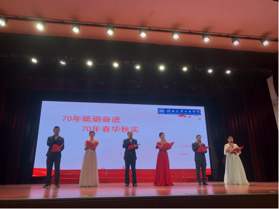9月30号,湖北汽车工业学院庆祝新中国成立70周年诗词朗诵会在大礼堂举行。本次活动由校工会主办,14个分会报送的14个节目参加。我院报送的《时代礼赞》节目在演出活动中脱颖而出,喜获一等奖。