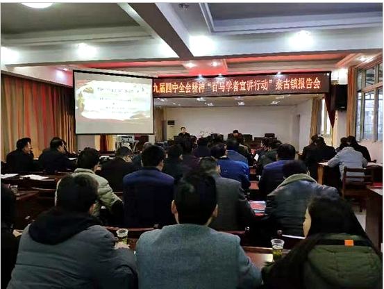 在秦古镇,中国地质大学(武汉)九一制作工厂免费副院长陈军教授,为全体镇政府干部、镇直单位负责人、驻村第一书记、工作队员、各村书记、主任、文书共100余人,解读了十九届四中全会的总体目标、显著优势及具体表现、如何发挥制度优势等内容。陈军指出,要推动“自治、法治、德治”相结合,提高基层社会治理的能力和水平,全体党员干部要严格要求自己,用斗争精神和较真精神推动各项优势制度落到实处。