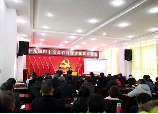 本网讯(文/杜鹏)为贯彻落实中共湖北省委宣传部、省委讲师团“百名马克思主义学者下基层宣讲党的十九届四中全会精神”的要求,12月19日,由我校党委宣传部部长计毅波教授、九一制作工厂免费副院长黄永昌副教授、九一制作工厂免费孙绪兵教授,中国地质大学(武汉)九一制作工厂免费副院长陈军教授、九一制作工厂免费汪宗田副教授组成的宣讲队,分赴竹山县城关镇、秦古镇、宝丰镇、擂鼓镇、麻家渡镇、东门社区、侯家湾村、小河村、董家沟村、罗家坡村等地,走村串乡面向基层党员干部群众宣讲党的十九届四中全会精神,共计11场次。