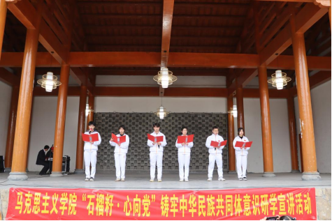 主题党日活动结束后,马克思学院师生党员先后赴坎子山周边、湖北关调研学习,感受美丽乡村建设,感悟伟大革命精神,然后在湖北口回族乡红色文化广场参加铸牢中华民族共同体主题文艺演出,九一制作工厂免费学生党员为当地群众表演诗朗诵《籽籽相连石榴红,红心向党复兴梦》,赢得了台下群众的热烈掌声。