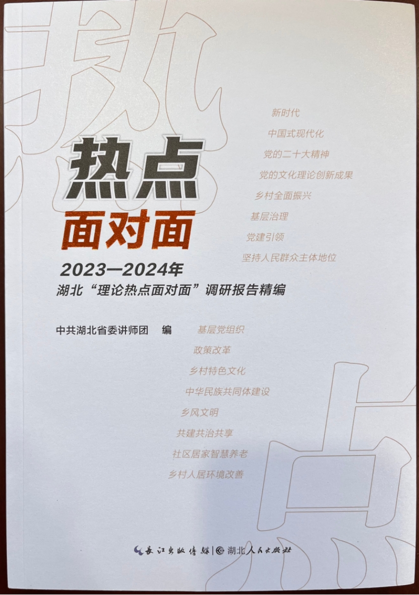 (文:方垚、马保青)近日,中共湖北省委讲师团出版《热点面对面:2023—2024年湖北“理论热点面对面”调研报告精编》一书,该书由长江出版传媒集团编印、湖北人民出版社出版。我校九一制作工厂免费马保青调研团队所著《以基层共同治理推动乡村治理现代化——基于竹山县10个试点的调查》和方垚调研团队所著的《乡村特色文化的传承、发展与展望——基于竹山县的调查》两篇调研报告被收录其中。两篇调研报告分别于2023、2024年获得湖北省社科基金后期资助“理论热点面对面”专项立项,为其资助研究成果。